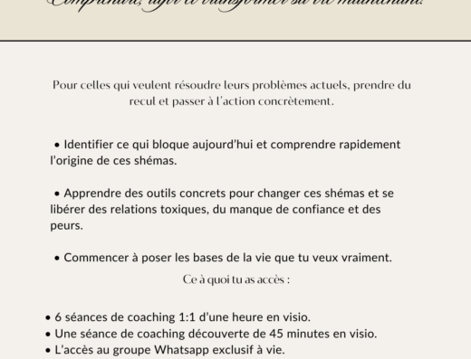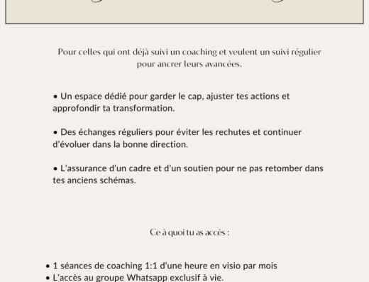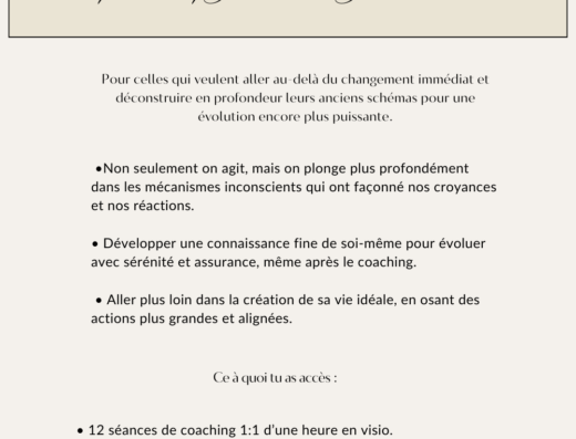 En deux années d’accompagnement, j’ai aidé de nombreuses femmes à reprendre confiance en elles, à se libérer de schémas toxiques, à se reconnecter à leur corps et à leurs besoins, et à créer une vie plus alignée et épanouissante.
